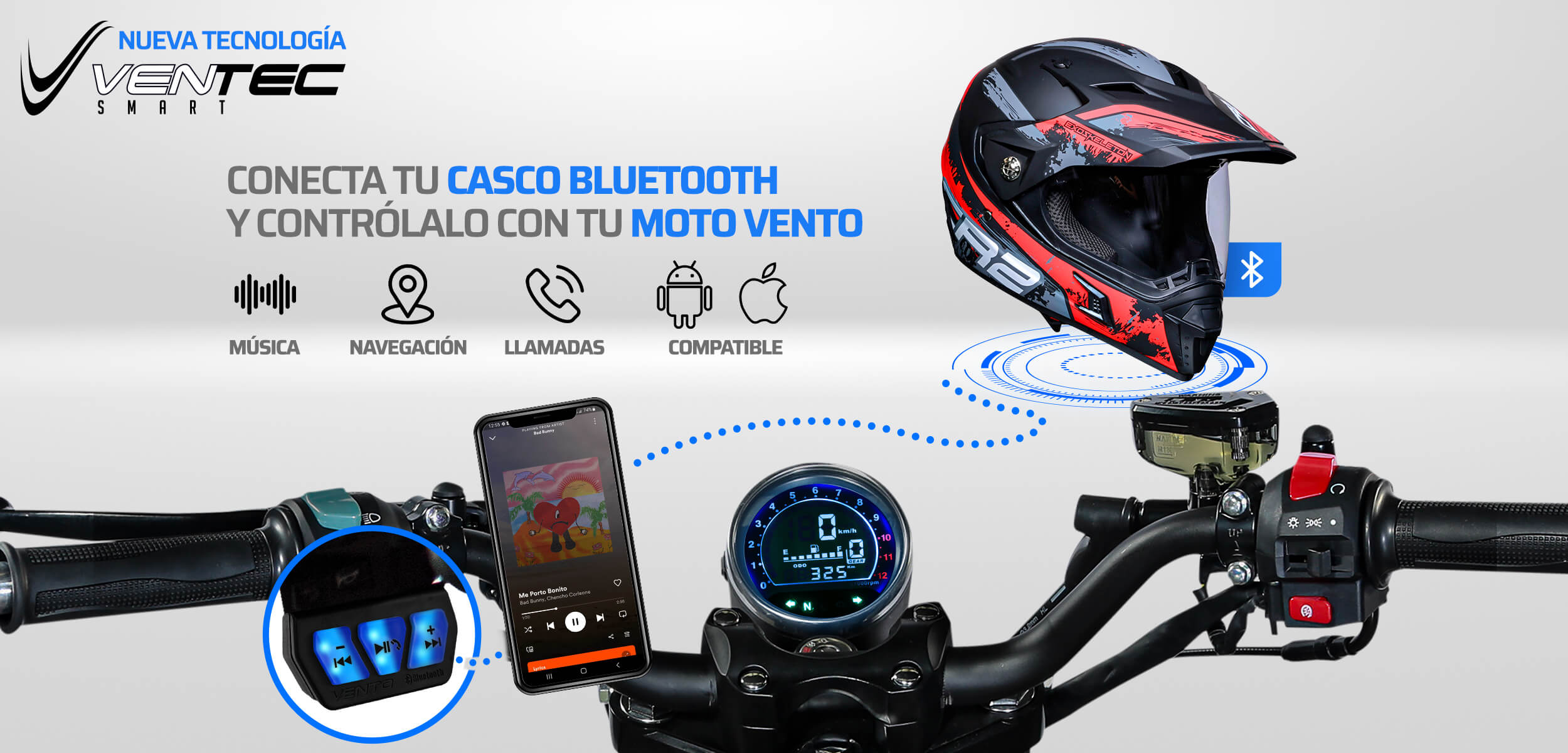 En todas las motos Vento 2023 y 2024 viene integrado el nuevo Centro de Comando, el cual te otorga control completo de tu conectividad. Sin quitar las manos del manubrio, podrás controlar el volumen de tu música, pausar o cambiar de canción, contestar llamadas, y lanzar tu asistente inteligente favorito. Este Centro de Comando es el punto de conectividad entre tu motocicleta y nuestra nueva línea de cascos VenTec.
